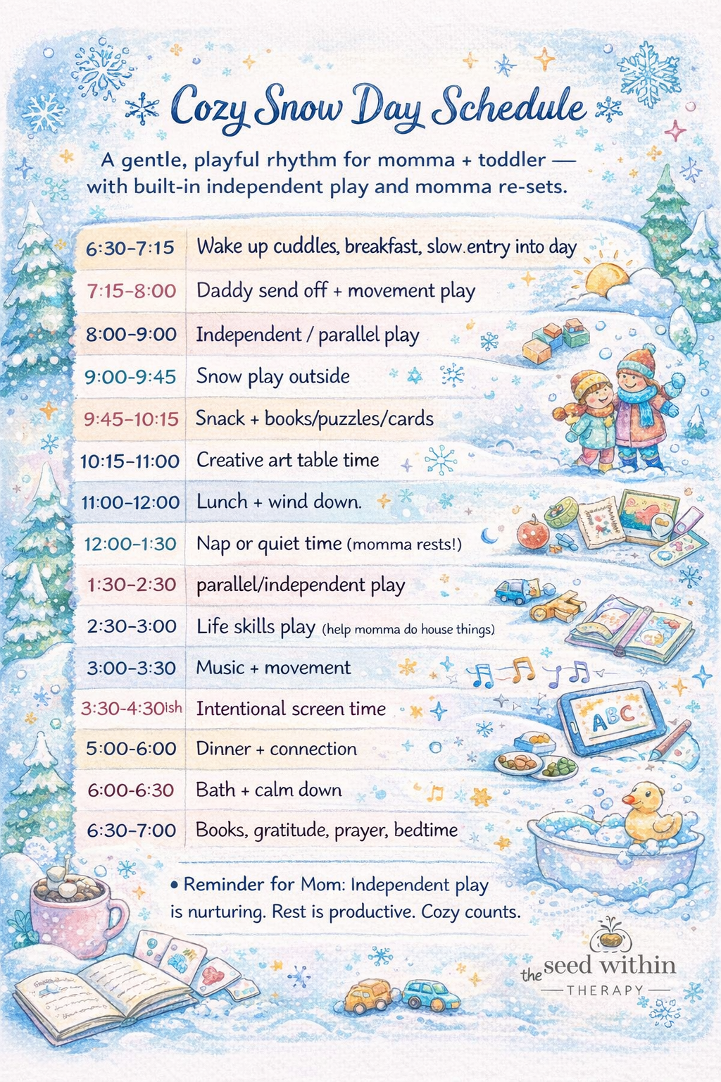 This freebie is your blueprint for a snow day that actually feels good—for you and your toddler. Think gentle, Montessori-ish rhythm, sprinkled with toddler wonder and novelty, plus built-in pockets of parallel play & quiet time so momma can breathe. Low-pressure, high-magic, and totally doable—because snow days should feel like joy, not a juggling act.